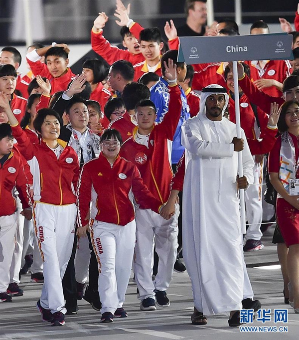 圖為3月14日,李想(中)與自己的偶像、前奧運冠軍李小鵬(前排右五)隨中國代表團在2019年阿布扎比夏季特奧會開幕式上入場。 新華社記者 夏一方 攝