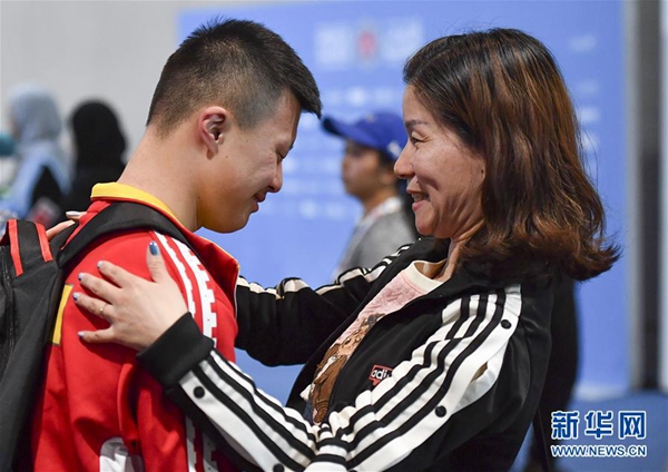 圖為3月13日,李想(左)在比賽后與母親楊建英在一起。 新華社記者 夏一方 攝