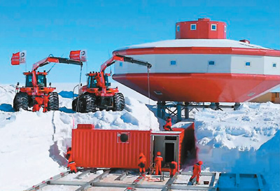 在南極大陸腹地,東經(jīng)76°58′、南緯73°51′,海拔高度2600多米的冰架雪野上,凌空飛懸著一個(gè)飛碟狀的建筑,它主體顏色是中國(guó)紅,中間臨窗一帶是靚麗的白色,頂端五星紅旗獵獵飄揚(yáng)。這就是中國(guó)南極泰山站。2014年1月,該站完成主體封頂,2月正式建成開(kāi)站。