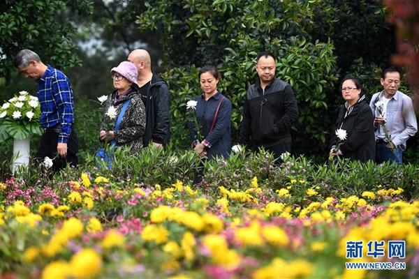 3月29日,在廣西柳州市西山墓園,親屬向逝者獻花。新華社發(黎寒池 攝)