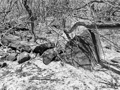 過火后的山石被燒成焦黑色。攝影/記者 董振杰