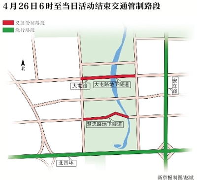 4月23日0時至4月26日活動結束,由北辰西路與大屯路交叉口(不含)經大屯路、天辰西路、大屯北路(不含)、湖景東路、國家體育場北路、景觀大道、慧忠路、天辰西路至大屯路以內區域道路,除持有“高峰論壇”專用證件的車輛外,禁止其他車輛通行。