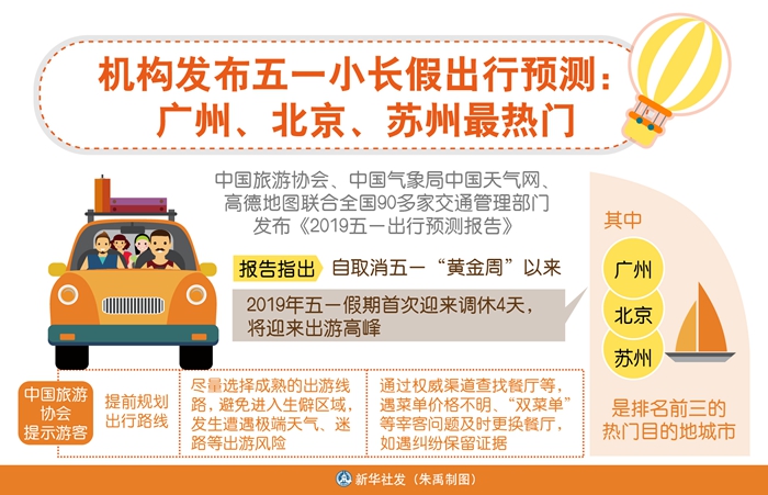 新華社北京4月29日電(記者魯暢)中國旅游協(xié)會(huì)、中國氣象局中國天氣網(wǎng)、高德地圖聯(lián)合全國90多家交通管理部門發(fā)布《2019五一出行預(yù)測報(bào)告》,報(bào)告指出,自取消五一“黃金周”以來,今年五一假期首次迎來調(diào)休4天,將迎來出游高峰,其中廣州、北京、蘇州是排名前三的熱門目的地城市。