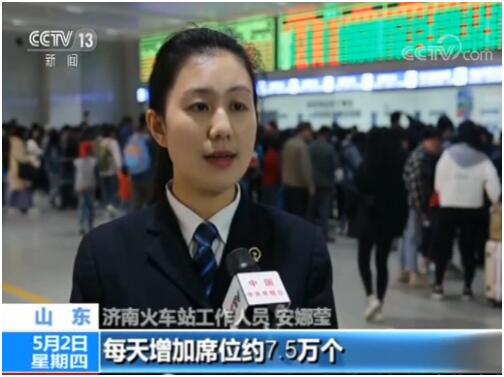 濟(jì)南火車站工作人員 安娜瑩:我們增開列車216趟,320趟動車組列車由八節(jié)車廂改為十六節(jié)車廂重聯(lián)運(yùn)行,每天增加席位約7.5萬個。
