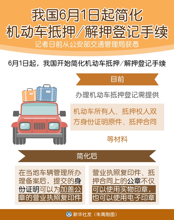 新華社北京5月28日電(記者王茜)6月1日起,我國(guó)開(kāi)始簡(jiǎn)化機(jī)動(dòng)車(chē)抵押/解押登記手續(xù)。這是記者日前從公安部交通管理局獲悉的。
