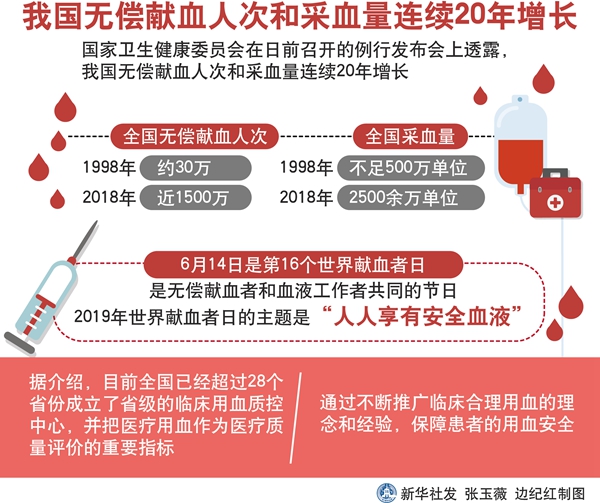 新華社北京6月11日電(記者屈婷)國家衛生健康委員會在日前召開的例行發布會上透露,我國無償獻血人次和采血量連續20年增長,2018年無償獻血人次接近1500萬,采血量達到了2500萬單位。