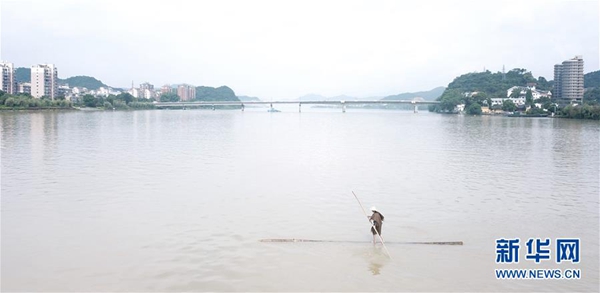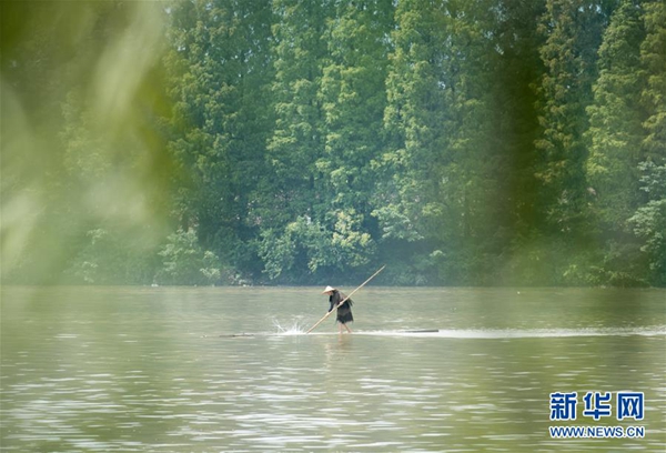 新華社杭州7月11日電(記者商意盈) 江面浩渺,霧氣氤氳。11日上午,浙江新安江上,一根大約8米長的毛竹越江而來,毛竹上站立著一位身穿蓑衣、頭戴斗笠的精瘦男子。他用手中的細竹竿作槳,輕輕劃水,不多時,人已到江心。