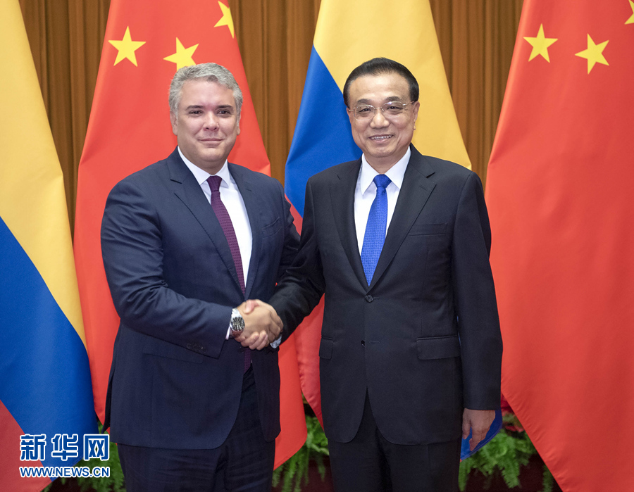 7月31日,國務(wù)院總理李克強(qiáng)在北京人民大會(huì)堂會(huì)見來華進(jìn)行國事訪問的哥倫比亞總統(tǒng)杜克。 新華社記者 李濤 攝