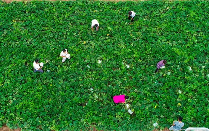 2019年7月7日,河北故城縣建國鎮姜圈村蔬菜基地,種植戶在采摘冬瓜。(新華社記者李曉果 攝)