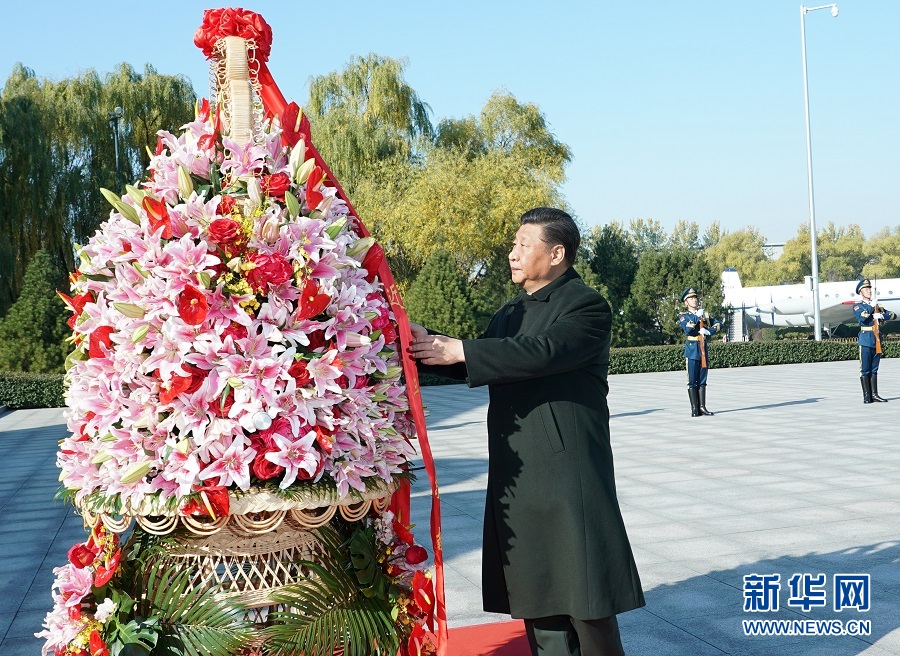 11月8日,中共中央總書記、國家主席、中央軍委主席習近平出席慶祝空軍成立70周年主題活動,代表黨中央和中央軍委,對空軍成立70周年表示熱烈祝賀,向空軍全體官兵致以誠摯問候。這是習近平來到位于北京市昌平區的中國航空博物館,向人民空軍英烈敬獻花籃。 新華社記者 李剛 攝