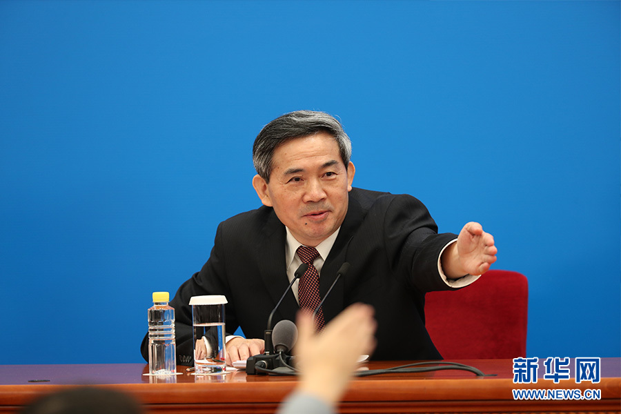 十三屆全國人大二次會議3月4日上午11時15分在人民大會堂新聞發布廳舉行新聞發布會,由大會發言人張業遂就大會議程和人大工作相關的問題回答中外記者提問。圖為新聞發布會主持人何紹仁。新華網/中國政府網 陳杰 攝