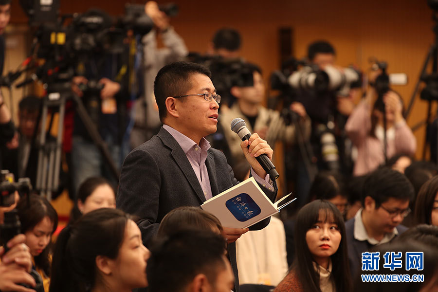 全國政協十三屆二次會議3月5日15:00在梅地亞中心多功能廳舉行記者會,邀請5位全國政協委員就“打贏防范化解重大風險、精準脫貧、污染防治三大攻堅戰”回答記者提問。圖為經濟日報記者提問。新華網/中國政府網 劉廈 攝