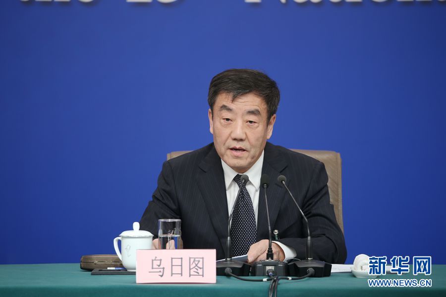 十三屆全國人大二次會議新聞中心3月9日在梅地亞中心新聞發布廳舉行記者會,邀請全國人大農業與農村委員會主任委員陳錫文、全國人大財政經濟委員會副主任委員烏日圖、全國人大常委會法制工作委員會副主任劉俊臣、全國人大常委會法制工作委員會副主任許安標、全國人大環境與資源保護委員會委員程立峰就“人大立法工作”相關問題回答記者提問。圖為全國人大財政經濟委員會副主任委員烏日圖。新華網/中國政府網 劉廈 攝