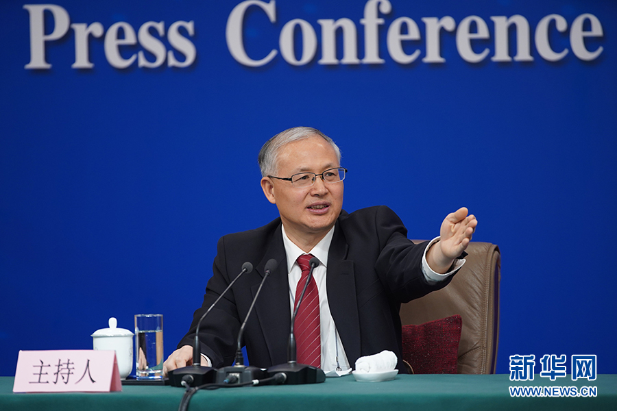 十三屆全國人大二次會議新聞中心于3月11日(星期一)15時在梅地亞中心新聞發布廳舉行記者會,邀請生態環境部部長李干杰就“打好污染防治攻堅戰”相關問題回答中外記者提問。圖為記者會主持人。新華網/中國政府網 劉廈 攝