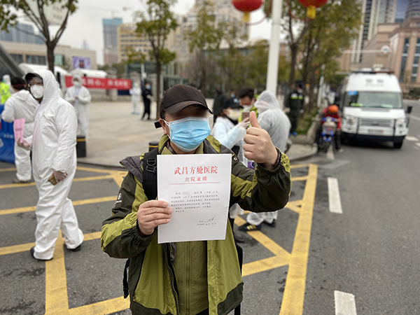 2月11日,在方艙治療5天后,許峰等來了期待已久的好消息:胸部CT檢測合格,兩次核酸檢測陰性。經湘雅二醫院和湖北省腫瘤醫院專家團隊評估后,許峰有幸成為了第一批從武昌方艙醫院出艙的28名患者之一。