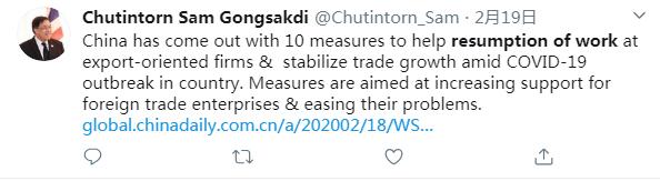 推特用戶Chutintorn Sam Gongsakdi說:在應(yīng)對新冠肺炎疫情期間,中國出臺了10項(xiàng)措施來幫助出口企業(yè)復(fù)工復(fù)產(chǎn),并推動貿(mào)易的穩(wěn)定增長。這些措施旨在加強(qiáng)對外貿(mào)企業(yè)的支持,并解決它們面臨的問題。