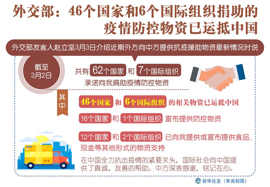 新華社北京3月3日電(記者朱超)外交部發(fā)言人趙立堅3日介紹近期外方向中方提供抗疫援助物資最新情況時說,截至3月2日,共有46個國家和6個國際組織的相關(guān)物資已運抵中國,中方深表感謝,銘記在心。