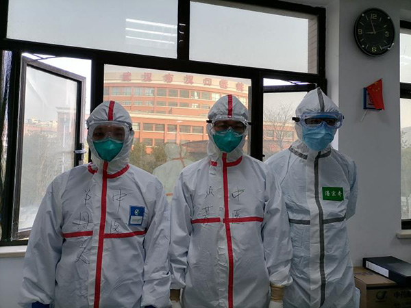 廣東省中醫院援助武漢漢口醫院的中醫小分隊成員鄭丹文(左)、顏芳(中)潘宗奇(右)。