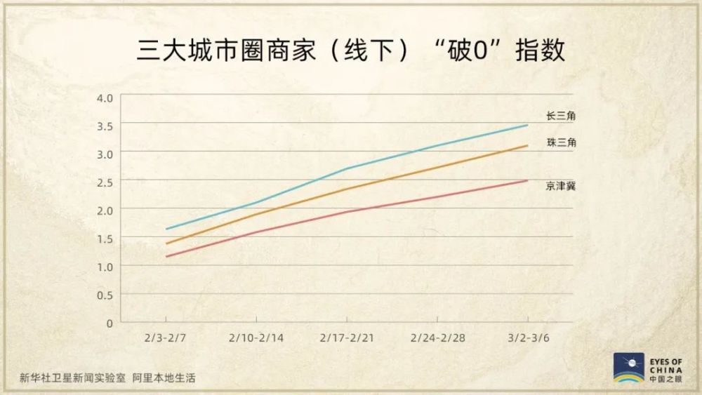 “破0”指數,是根據商家恢復營業獲得首筆收入、復工后的持續營業時間等計算得出,這兩張圖呈現出,在三大城市圈,復工復產并獲得收入的商家不斷增多。