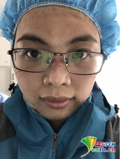 脫下厚重的防護設備后,黃春芬的臉頰、額頭滿是壓痕。受訪者供圖