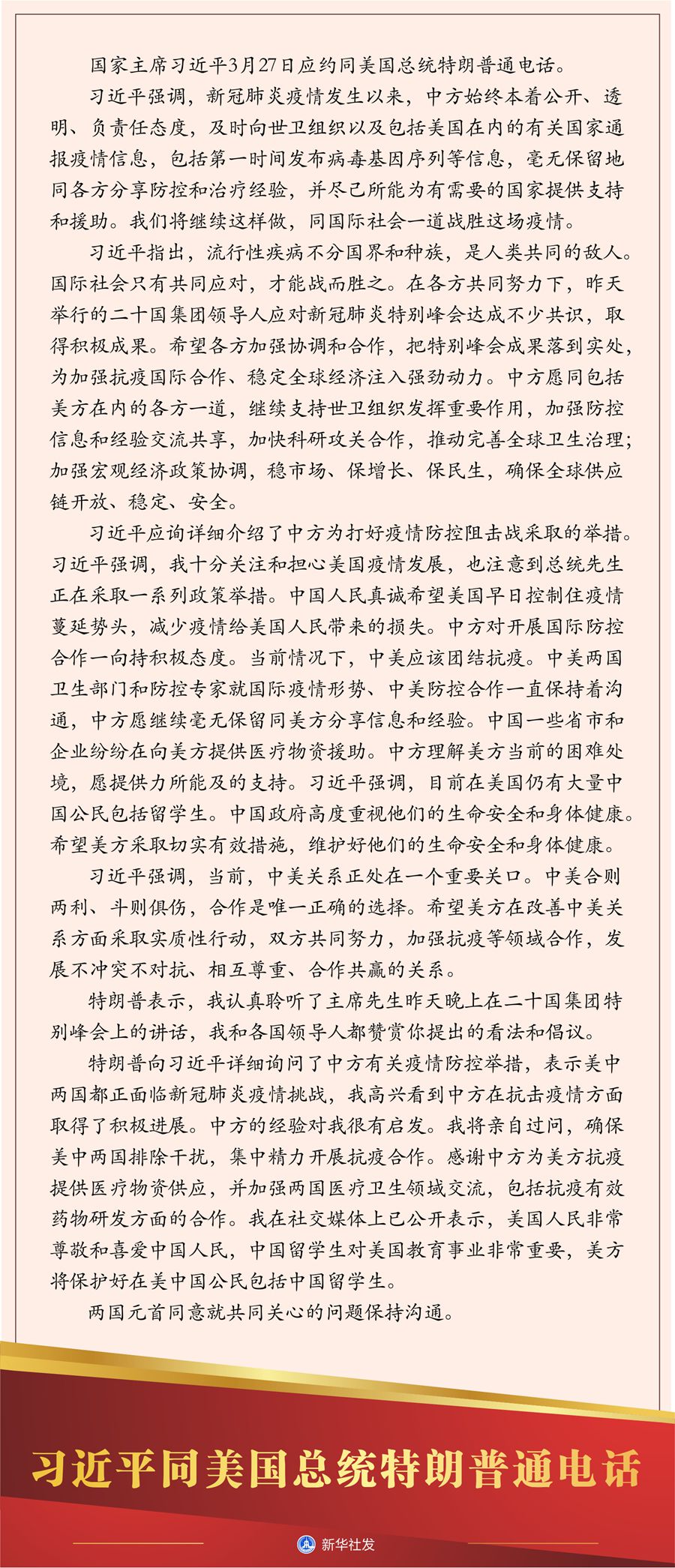 習近平應詢詳細介紹了中方為打好疫情防控阻擊戰(zhàn)采取的舉措。習近平強調,我十分關注和擔心美國疫情發(fā)展,也注意到總統(tǒng)先生正在采取一系列政策舉措。中國人民真誠希望美國早日控制住疫情蔓延勢頭,減少疫情給美國人民帶來的損失。中方對開展國際防控合作一向持積極態(tài)度。當前情況下,中美應該團結抗疫。中美兩國衛(wèi)生部門和防控專家就國際疫情形勢、中美防控合作一直保持著溝通,中方愿繼續(xù)毫無保留同美方分享信息和經驗。中國一些省市和企業(yè)紛紛在向美方提供醫(yī)療物資援助。中方理解美方當前的困難處境,愿提供力所能及的支持。習近平強調,目前在美國仍有大量中國公民包括留學生。中國政府高度重視他們的生命安全和身體健康。希望美方采取切實有效措施,維護好他們的生命安全和身體健康。