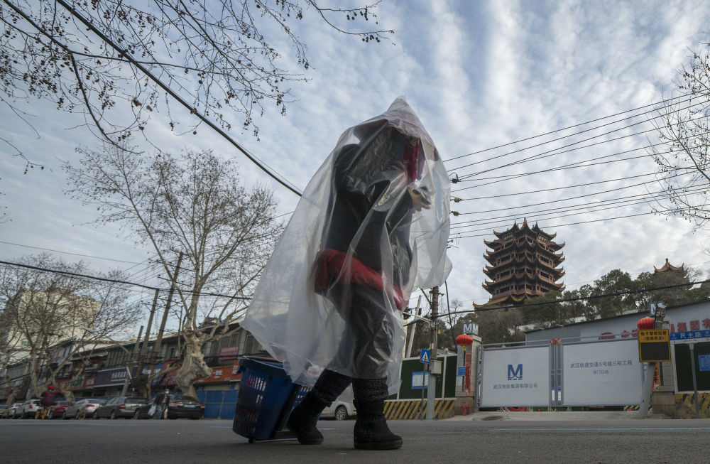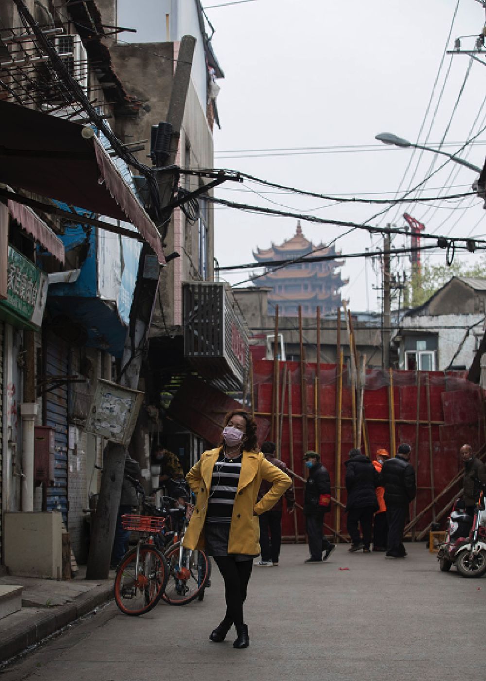 ↑3月15日,一位身穿自制“防護(hù)服”的女士上街買菜時從黃鶴樓下走過。她說她近兩個月來,只出過兩次門。