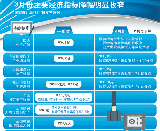 前3月國內生產總值同比下降,3月份主要經濟指標呈現回升勢頭
