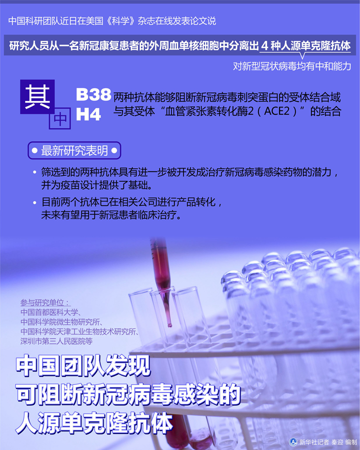 圖表:中國團(tuán)隊發(fā)現(xiàn)可阻斷新冠病毒感染的人源單克隆抗體 新華社記者 秦迎 編制