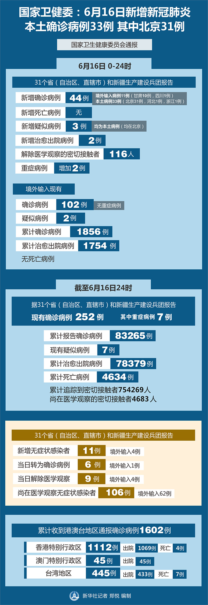 截至6月16日24時,據31個?。ㄗ灾螀^、直轄市)和新疆生產建設兵團報告,現有確診病例252例(其中重癥病例7例),累計治愈出院病例78379例,累計死亡病例4634例,累計報告確診病例83265例,現有疑似病例7例。累計追蹤到密切接觸者754269人,尚在醫學觀察的密切接觸者4683人。