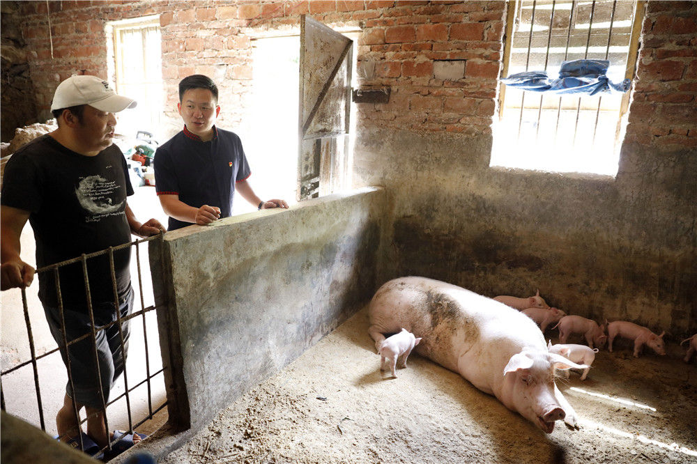 6月16日,趙少輝(右)在貧困戶盤良嫩的豬場了解情況。新華社記者 黃國保 攝