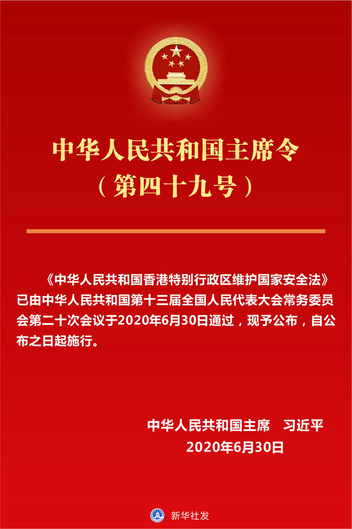《中華人民共和國香港特別行政區維護國家安全法》已由中華人民共和國第十三屆全國人民代表大會常務委員會第二十次會議于2020年6月30日通過,現予公布,自公布之日起施行。