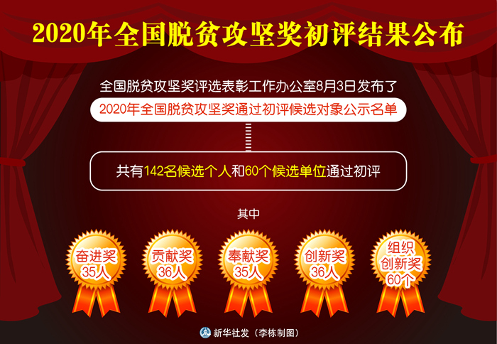 新華社北京8月3日電(記者侯雪靜)全國脫貧攻堅獎評選表彰工作辦公室3日發布了2020年全國脫貧攻堅獎通過初評候選對象公示名單,共有142名候選個人和60個候選單位通過初評,其中奮進獎有35人,貢獻獎36人,奉獻獎35人,創新獎36人,組織創新獎60個。