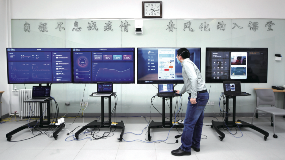2月17日,工作人員在管理維護清華大學在線教學平臺 “雨課堂”(鞠煥宗/攝)