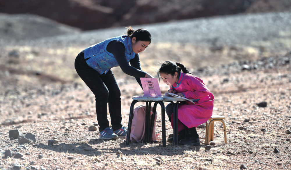 4月1日,內(nèi)蒙古自治區(qū)阿拉善左旗蒙古族學校四年級學生策耿(右)在家附近的戈壁上上網(wǎng)課(劉磊/攝)
