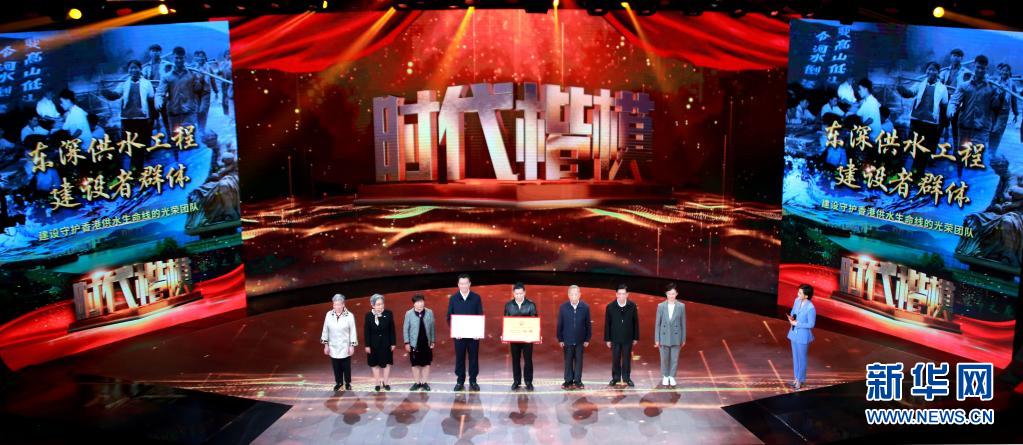 東深供水工程建設者群體代表在“時代楷模”發布儀式上領取“時代楷模”獎牌和證書(2021年4月18日攝)。新華社記者 潘旭 攝