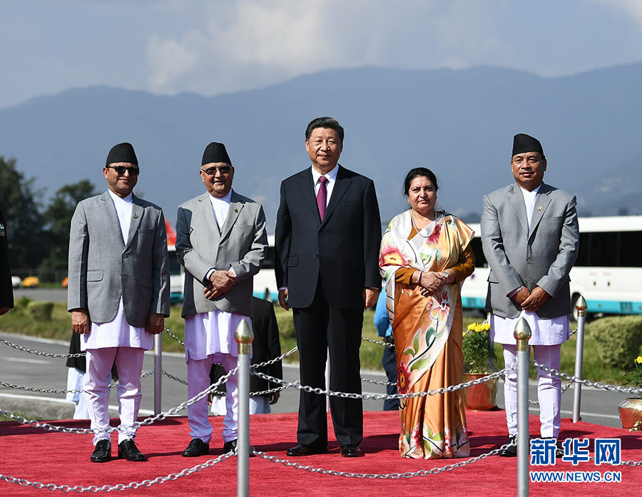 當地時間10月13日中午,國家主席習近平離開加德滿都啟程回國。尼泊爾總統班達里在機場為習近平舉行隆重歡送儀式。尼泊爾副總統普恩、總理奧利、聯邦議會聯邦院主席蒂米爾西納、所有內閣成員、軍方高級將領參加。 新華社記者 謝環馳 攝