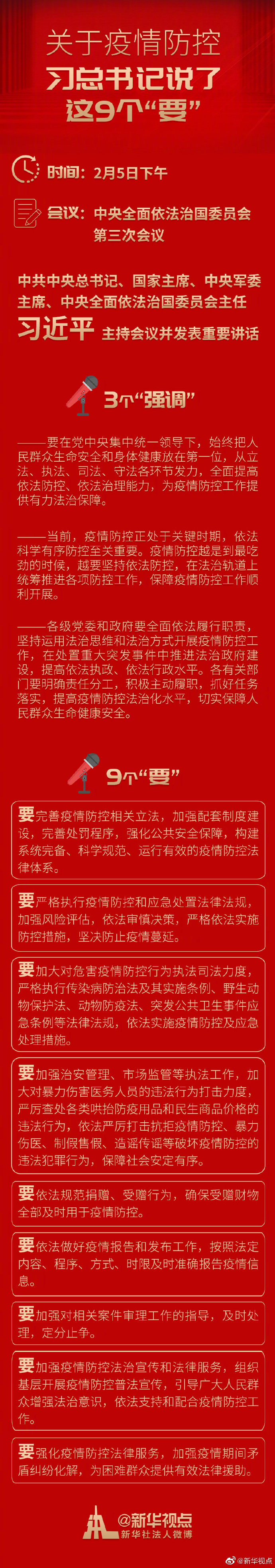 2月5日下午,中共中央總書記、國家主席、中央軍委主席、中央全面依法治國委員會主任習近平主持召開中央全面依法治國委員會第三次會議強調,全面提高依法防控依法治理能力,為疫情防控提供有力法治保障。