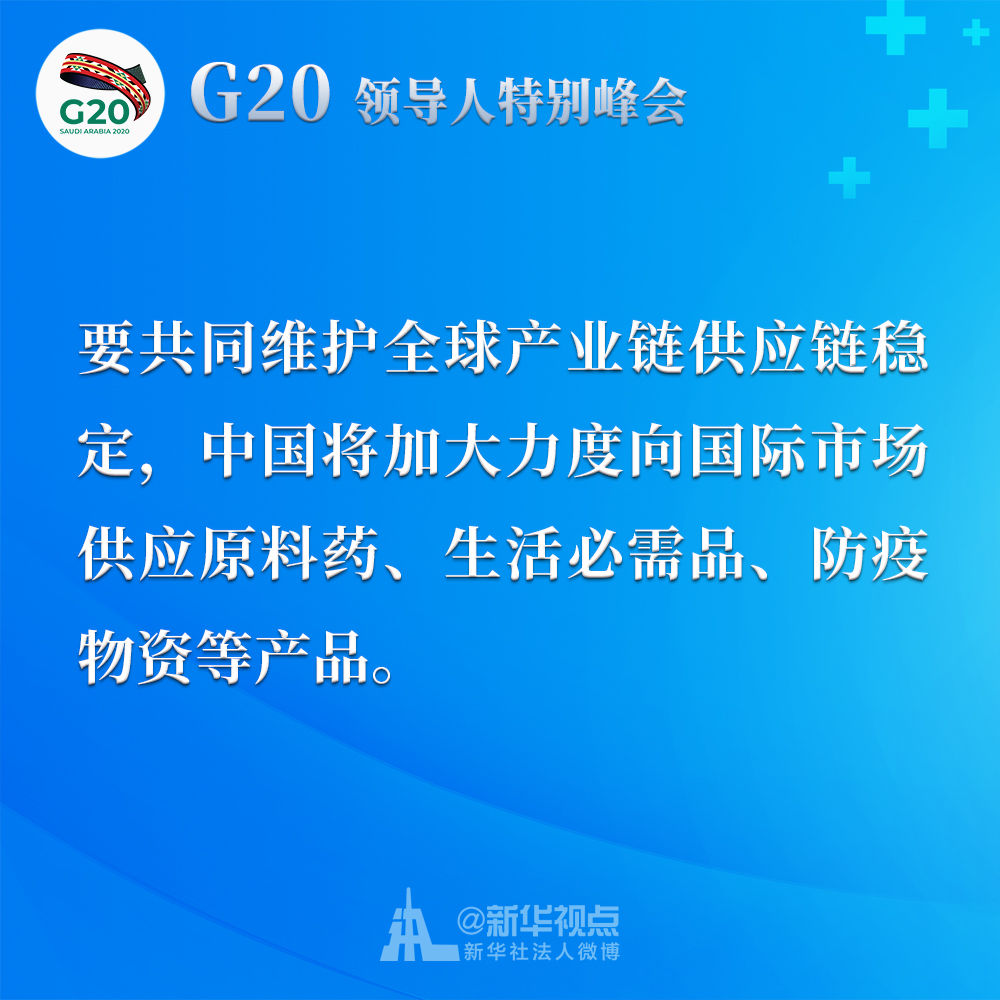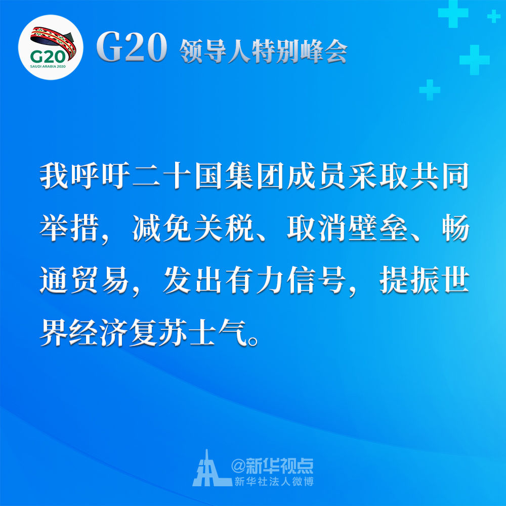 我呼吁二十國(guó)集團(tuán)成員采取共同舉措,減免關(guān)稅、取消壁壘、暢通貿(mào)易,發(fā)出有力信號(hào),提振世界經(jīng)濟(jì)復(fù)蘇士氣。我們應(yīng)該制定二十國(guó)集團(tuán)行動(dòng)計(jì)劃,并就抗疫宏觀(guān)政策協(xié)調(diào)及時(shí)作出必要的機(jī)制性溝通和安排。