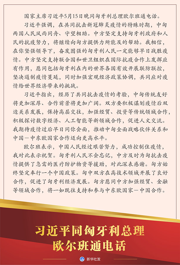 習(xí)近平指出,經(jīng)歷了共同抗擊疫情的考驗,中匈傳統(tǒng)友好將更加深厚、合作前景將更加廣闊。雙方要積極謀劃疫情后雙邊關(guān)系發(fā)展,保持高層交往,加強(qiáng)經(jīng)貿(mào)、投資等傳統(tǒng)領(lǐng)域合作,積極探討數(shù)字經(jīng)濟(jì)、人工智能等新領(lǐng)域合作,促進(jìn)人文交流。我期待疫情過后早日同你會面,推動中匈全面戰(zhàn)略伙伴關(guān)系和中國-中東歐國家合作邁向更高水平。