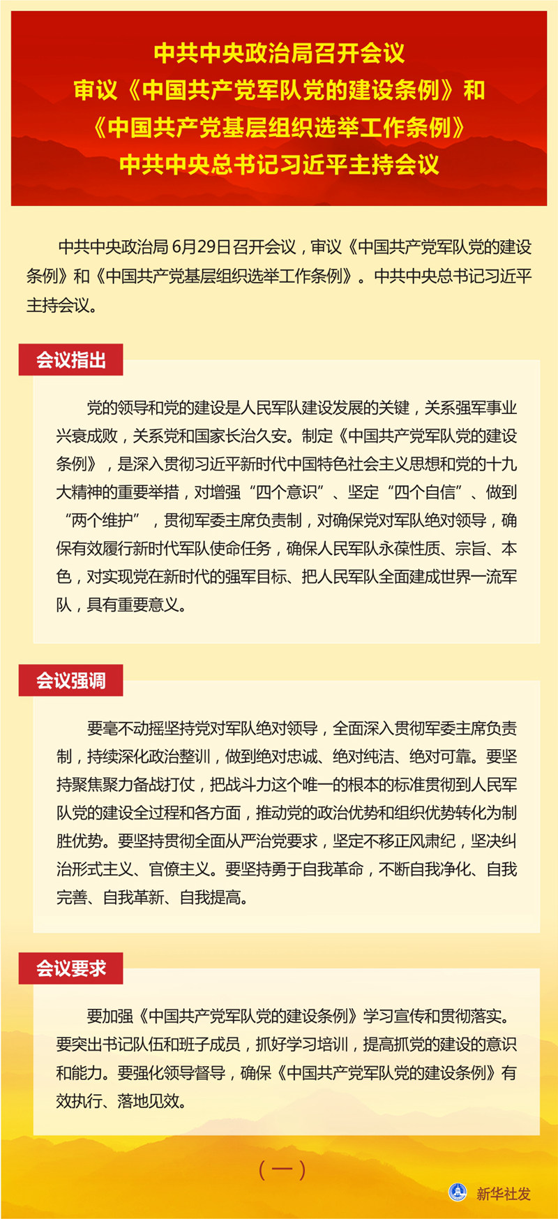 新華社北京6月29日電? 中共中央政治局6月29日召開會議,審議《中國共產(chǎn)黨軍隊黨的建設條例》和《中國共產(chǎn)黨基層組織選舉工作條例》。中共中央總書記習近平主持會議。