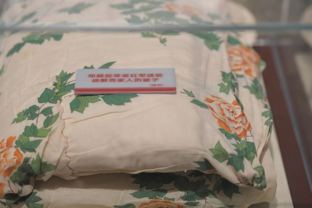 “在湖南汝城縣沙洲村,3名女紅軍借宿徐解秀老人家中,臨走時,把自己僅有的一床被子剪下一半給老人留下了。”