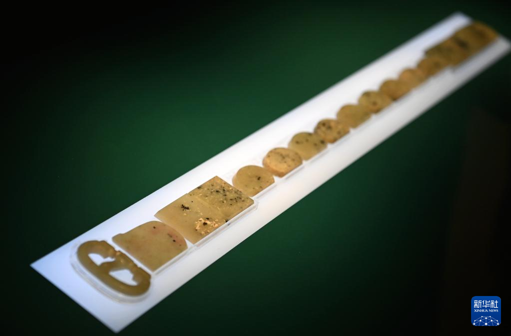 这是在陕西历史博物馆拍摄的骨咄玉带銙(5月11日摄)。“骨咄”即珂咄罗,是位于今塔吉克斯坦和阿富汗之间的中亚小国,史籍记载与唐王朝交往密切。