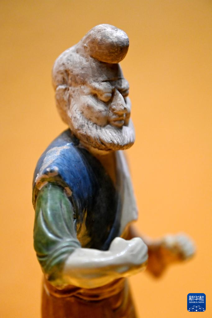 这是在西安博物院展出的唐代三彩胡人牵马(驼)陶俑(5月8日摄)。唐代的长安城中居住着大批胡人,胡乐、胡服风靡长安,经考古出土的陶俑中有为数不少的胡人形象。