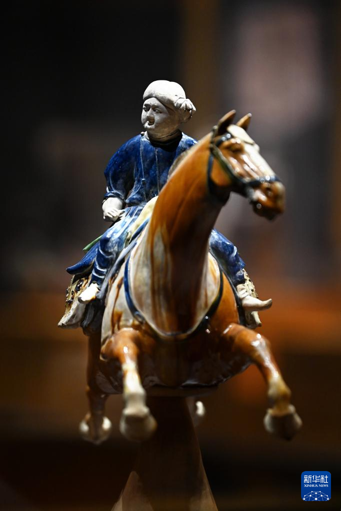 这是在西安博物院展出的唐代三彩腾空马(5月8日摄)。飞腾的三彩马上骑有一胡俑,真实再现了丝绸之路上西域胡人急奔长安的生动形象。