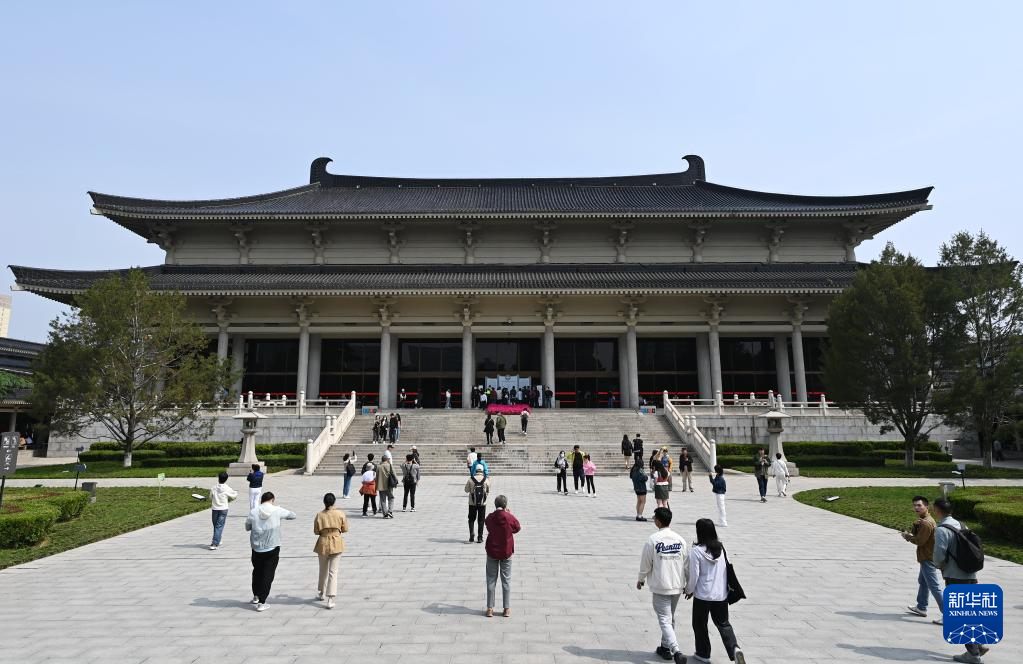 5月8日,游客在西安博物院参观史君墓石椁。墓主史君是北周凉州萨保,粟特人。石椁整体为中国传统歇山顶殿堂式建筑,四壁浮雕内容和风格则带有鲜明的西域特色。
