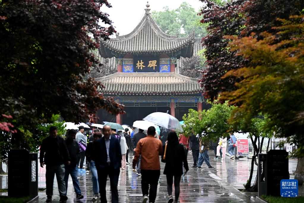 5月9日,游客在西安碑林博物馆内参观唐代石狮。古代中国的狮子多通过丝绸之路由外国进贡而来。