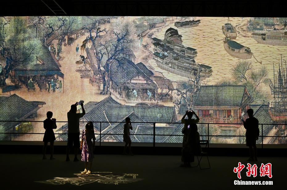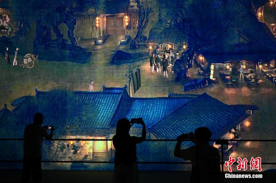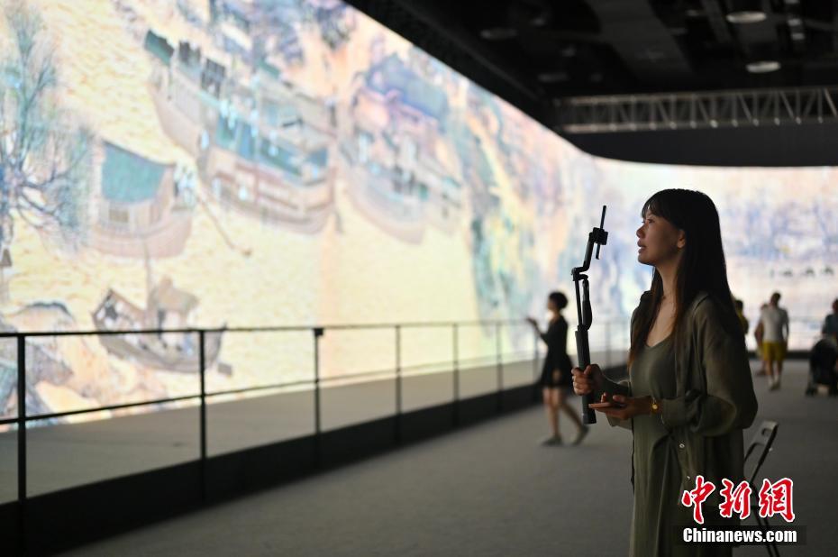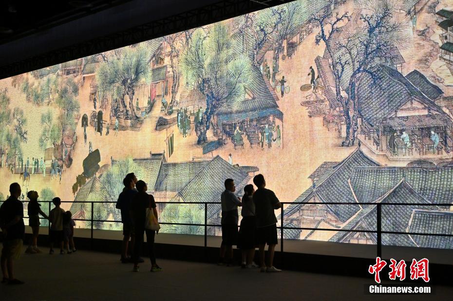 7月9日,广西南宁,市民参观在南宁国际会展中心展出的“会动的《清明上河图》展览”。此次展览以北宋画家张择端所绘《清明上河图》为蓝本,通过巨幕荧屏将原作放大数百倍,复原上千个画中人物,再现北宋时期的繁华盛景。
