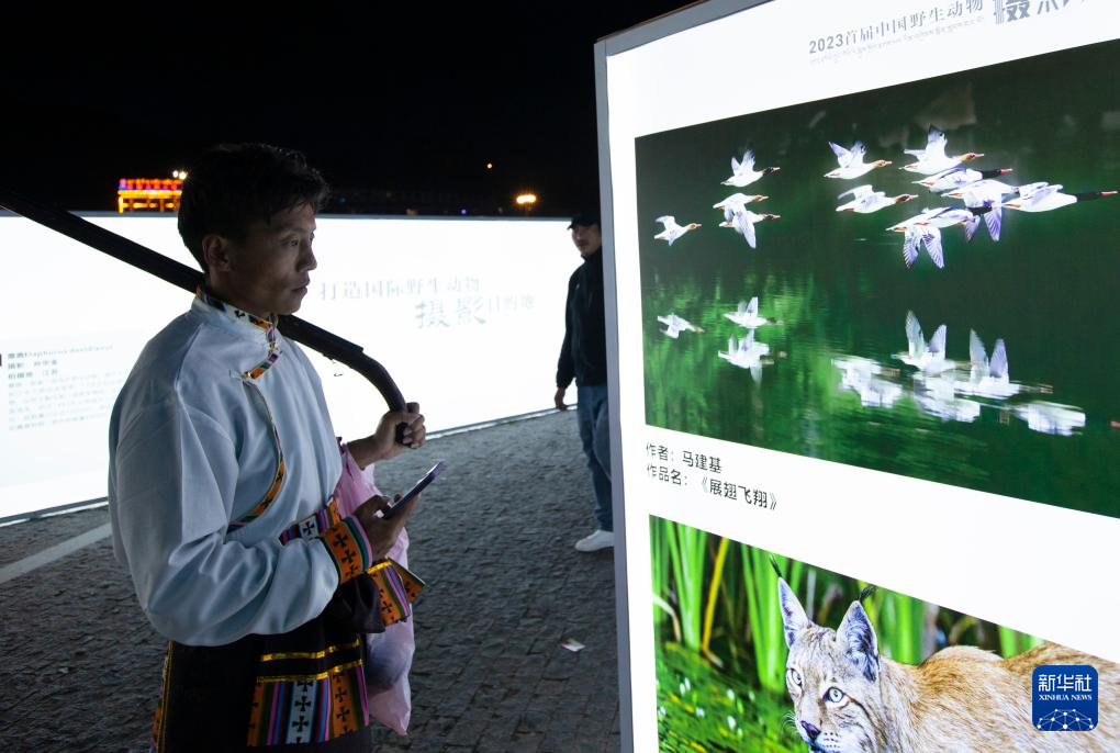 7月23日,人们在青海玉树格萨尔广场参观2023首届中国野生动物摄影大展预展。