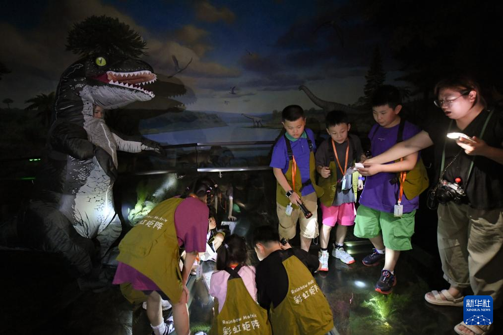 7月26日,参加夜游的孩子们在博物馆内了解恐龙。