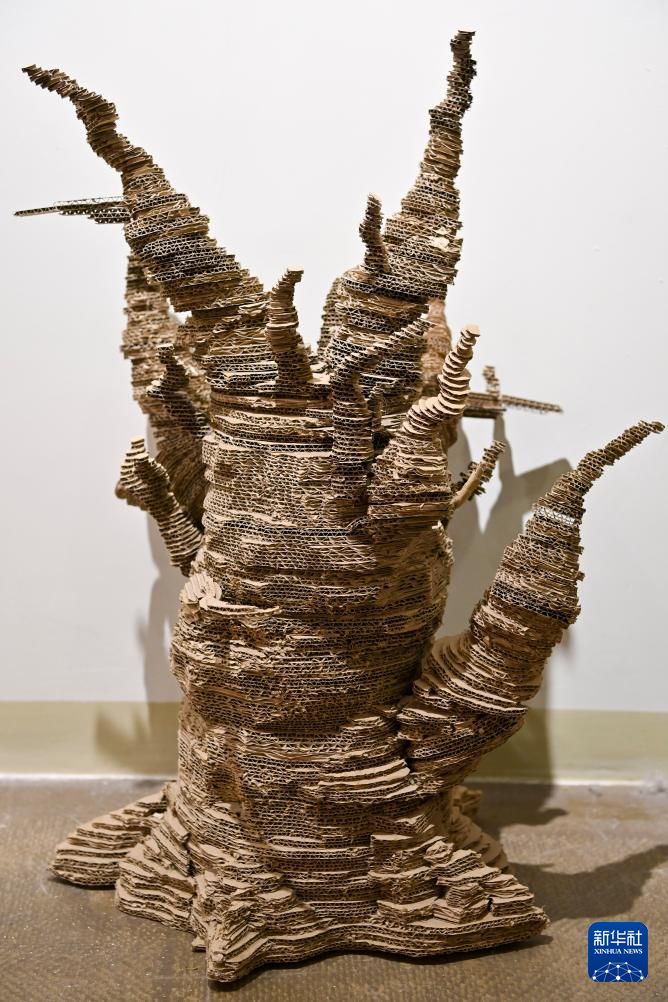这是王帅栋以洪洞大槐树为原型创作的瓦楞纸作品(8月1日摄)。